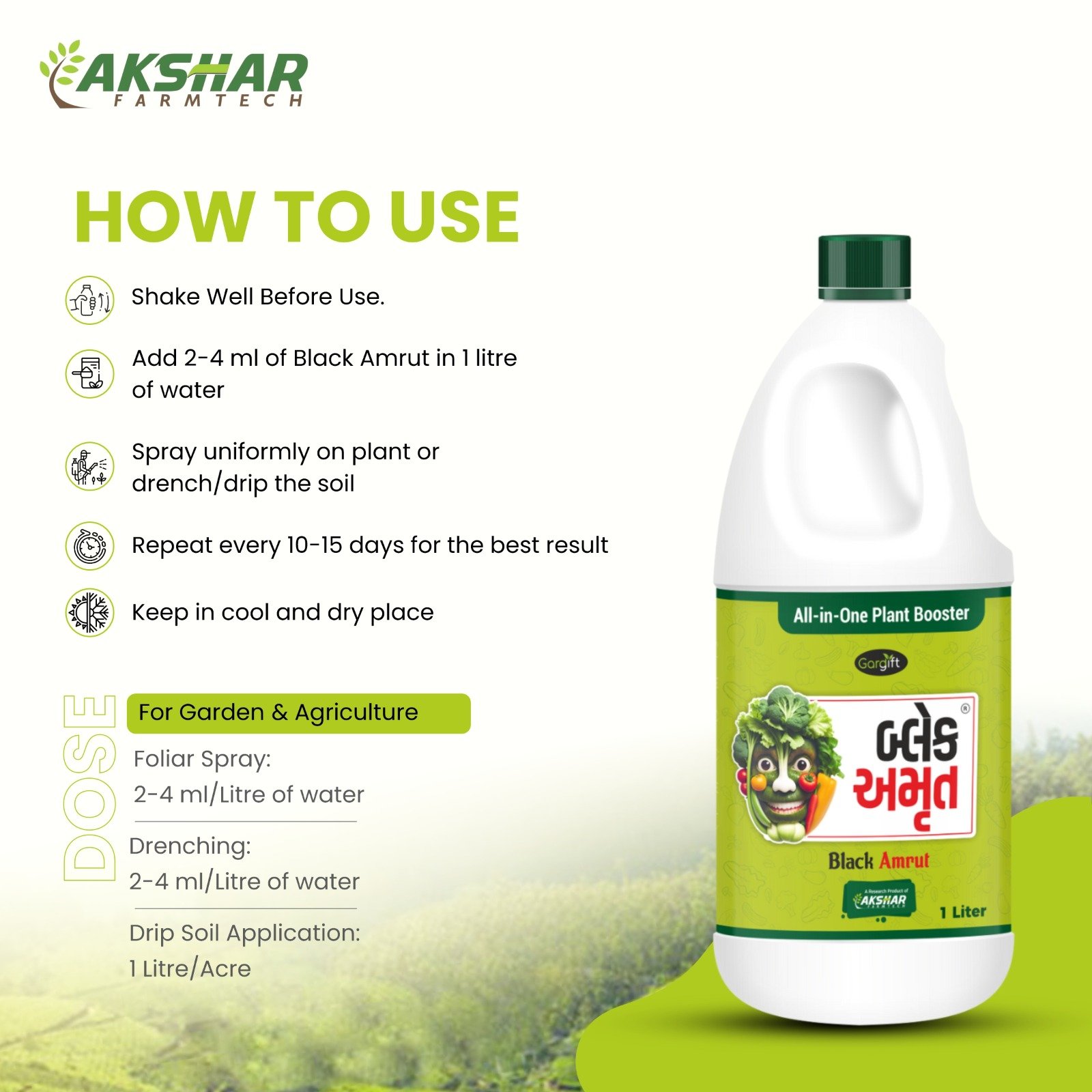 | Location | Bopal | About | Black Amrut is a nano-technology-based advance plant tonic designed to enhance plant growth and boost crop production. It contains essential nutrients, soluble carbon, and natural plant growth enhancers derived from natural extracts. This eco-friendly solution promotes root development, flowering, fruit size improvement, and prevents yellowing or premature dropping of crops. Suitable for a wide range of crops like cotton, groundnut, sesame, soyabean, chickpeas, grams, green grams, wheat, millet, | ||